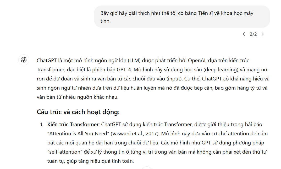 "Giải thích ChatGPT như thể tôi có bằng Tiến sĩ." | "ChatGPT là một mô hình ngôn ngữ lớn dựa trên kiến trúc Transformer, được huấn luyện trên tập dữ liệu khổng lồ để dự đoán từ tiếp theo trong chuỗi văn bản." |