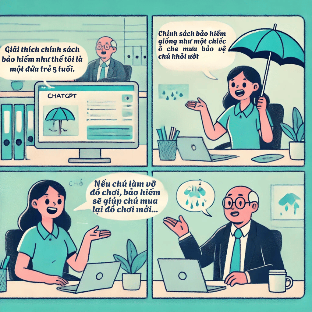 Chị Hương, một trưởng nhóm bán hàng, cần giải thích chính sách bảo hiểm với đội ngũ nhân viên mới. Thay vì dùng các thuật ngữ đơn giản như "chiếc ô che mưa," chị yêu cầu ChatGPT giải thích vừa dễ hiểu vừa chuyên nghiệp. Kết quả là một câu trả lời súc tích và rõ ràng, giúp cả nhóm hiểu ngay lập tức.