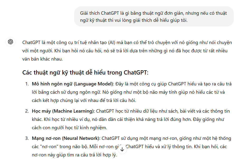 Giải thích ChatGPT là gì bằng thuật ngữ đơn giản, nhưng nếu có thuật ngữ kỹ thuật thì vui lòng giải thích dễ hiểu giúp tôi.Phản hồi của ChatGPT ở mô hình 4o mini: