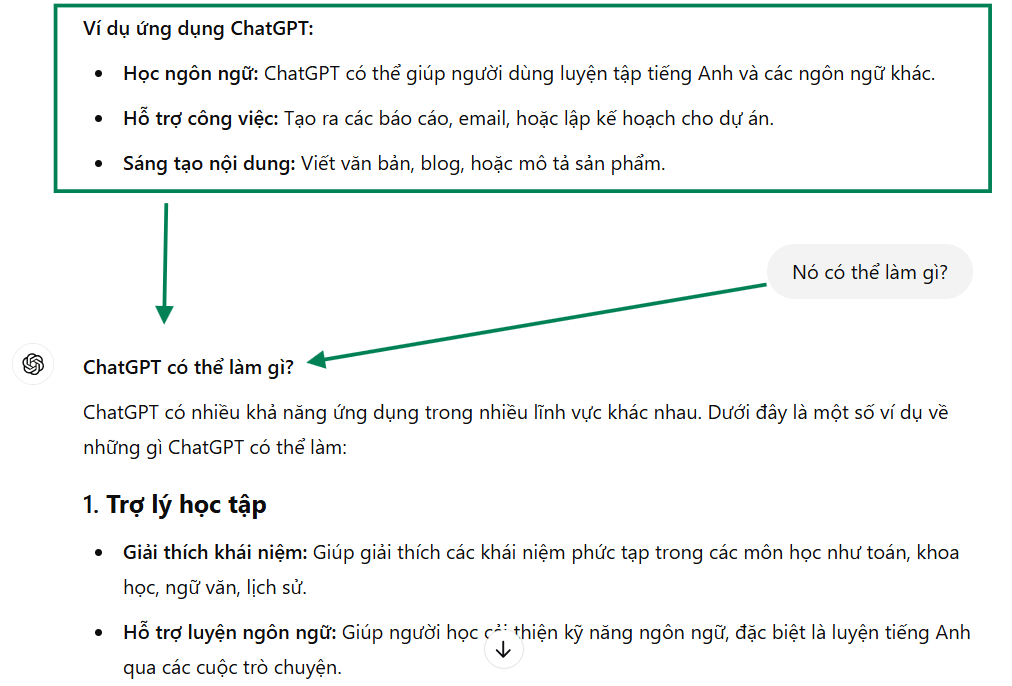 Trong trường hợp này, ChatGPT hiểu rằng "nó" ám chỉ chính ChatGPT nhờ thông tin từ câu hỏi trước.