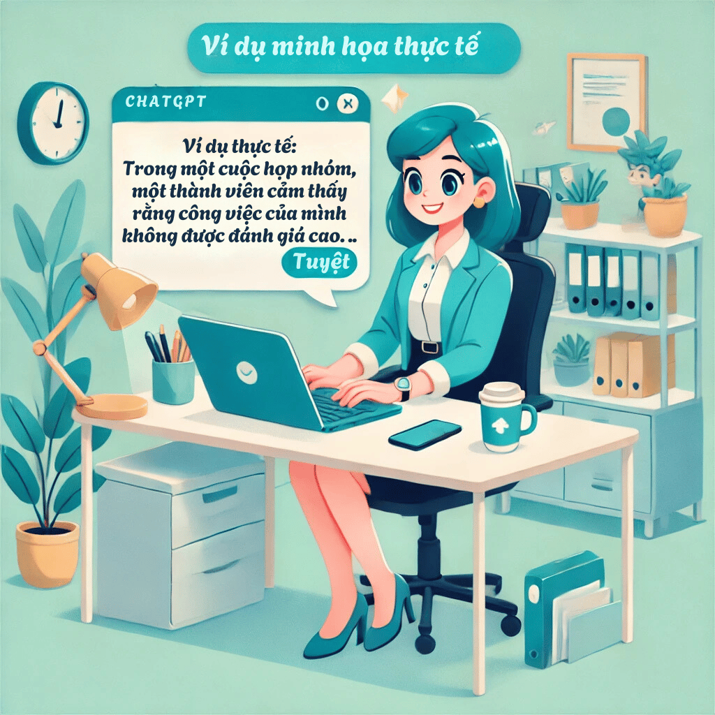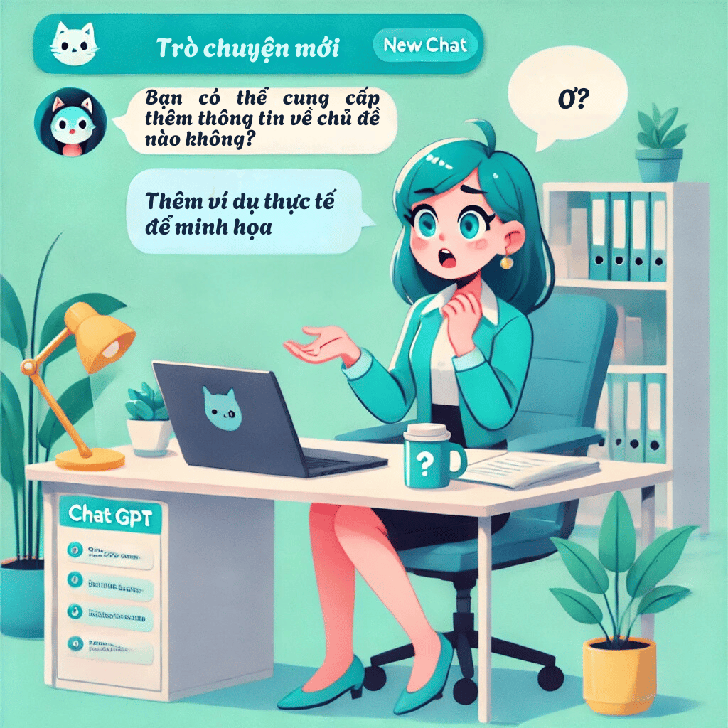 Sau khi nhận được phản hồi, chị tiếp tục nhập: "Thêm ví dụ thực tế để minh họa." ChatGPT ngay lập tức bổ sung ví dụ vì nó hiểu ngữ cảnh từ câu hỏi trước
