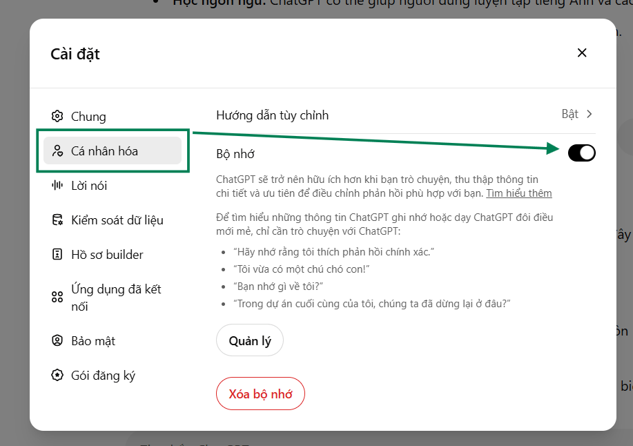 Kiểm soát bởi người dùng: Bạn có thể yêu cầu ChatGPT ghi nhớ hoặc quên bất kỳ thông tin nào.