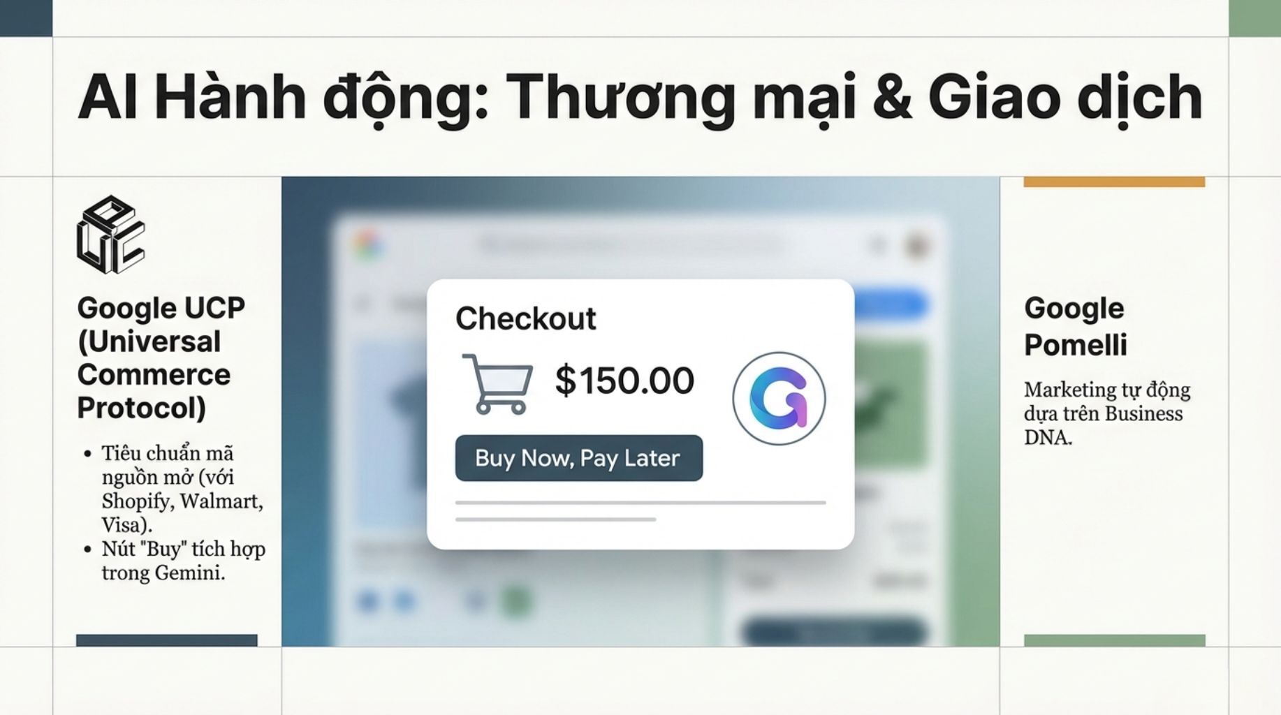 Google không chỉ dừng lại ở việc tạo ra Gemini mà còn ra mắt Giao thức Thương mại Toàn cầu (UCP). Đây là game-changer khi AI có thể thay mặt bạn mua hàng trực tiếp trong cuộc hội thoại!