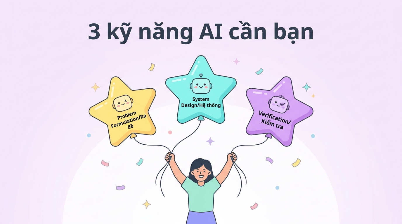 Kỹ năng ra đề — khả năng mô tả rõ ràng điều bạn muốn, cung cấp ngữ cảnh, chia nhỏ nhiệm vụ, và cho AI ví dụ mẫu. ARC AGI 3 cho thấy: con người 100%, AI 0,25% — khoảng cách nằm ở việc "đặt vấn đề," không phải "giải vấn đề."