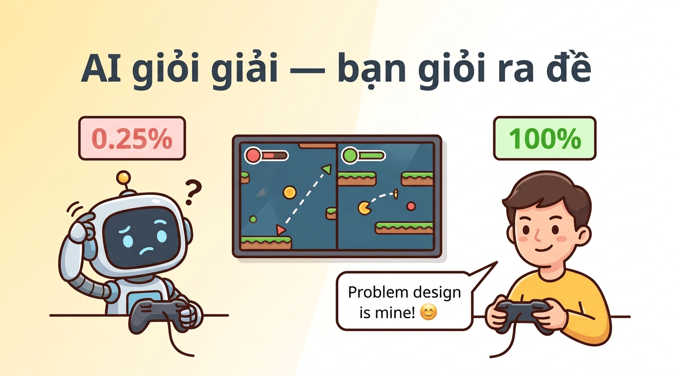 Điều này có nghĩa: kỹ năng "ra đề" cho AI — khả năng mô tả vấn đề, chia nhỏ nhiệm vụ, cung cấp ngữ cảnh, và kiểm tra kết quả — là kỹ năng mà AI không tự làm thay bạn được. Đây là khoảng cách 99,75% giữa con người và AI trong bài test thực tế.