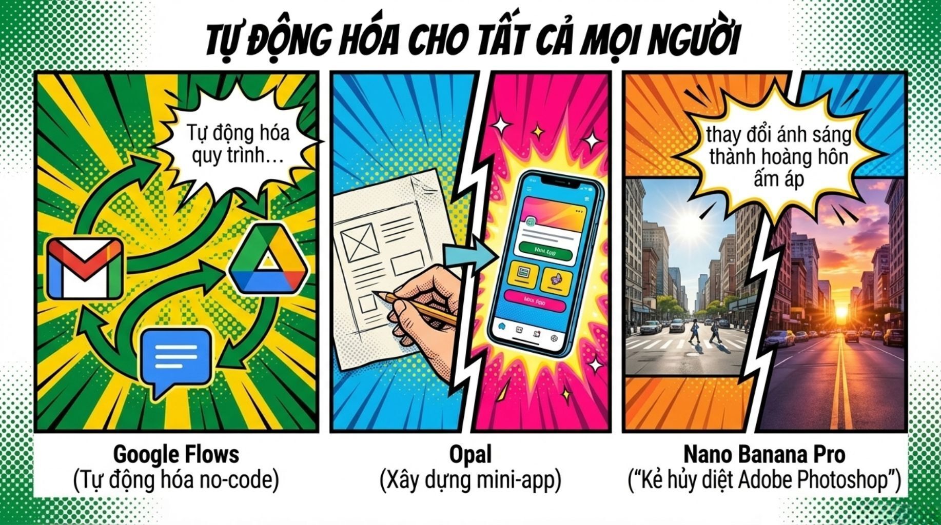 • Google Flows & Opal: Flows là nền tảng tự động hóa AI không cần mã trong Google Workspace, cho phép bạn tự động hóa quy trình làm việc (như Gmail, Drive, Chat) bằng các lệnh ngôn ngữ tự nhiên. Opal cũng là một công cụ xây dựng ứng dụng no-code, cho phép tạo mini-app tùy chỉnh chỉ bằng mô tả.