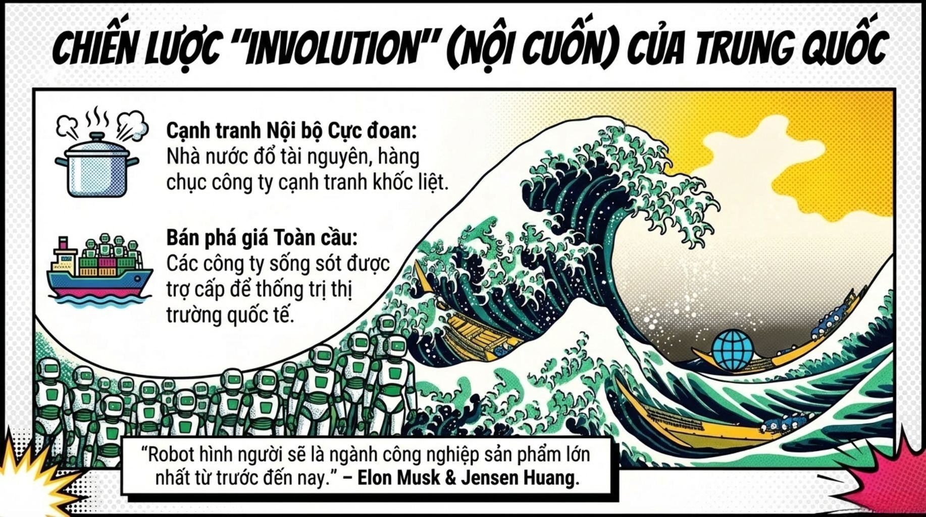 Những nhân vật có tầm ảnh hưởng lớn như Elon Musk và Jensen Huang đều tin rằng robot hình người sẽ là ngành công nghiệp lớn nhất trong lịch sử. Trung Quốc đang áp dụng chiến lược "Involution" (Nội cuốn) để thống trị lĩnh vực này. Mô hình này hoạt động theo các bước: