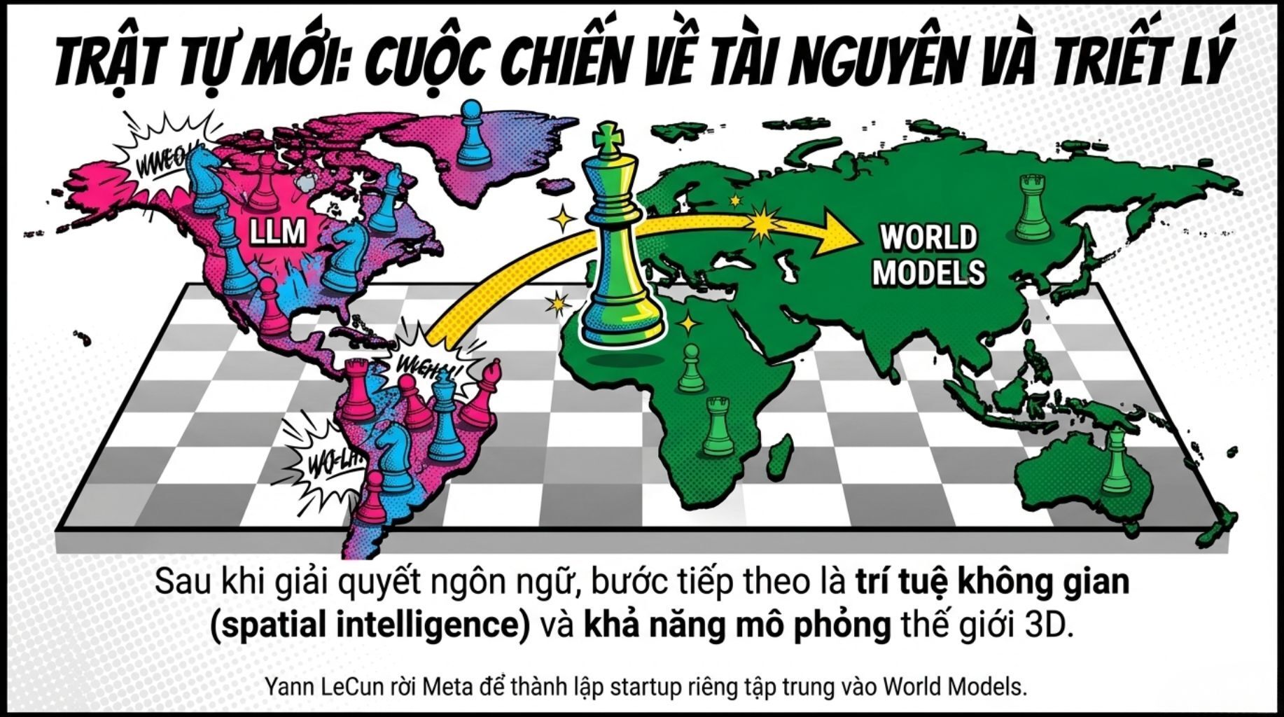 LeCun và Dr. Fei-Fei Li (ImageNet) đều tin rằng sau khi giải quyết được ngôn ngữ (LLM), bước tiếp theo là giải quyết trí tuệ không gian (spatial intelligence) và khả năng hiểu, mô phỏng thế giới 3D.