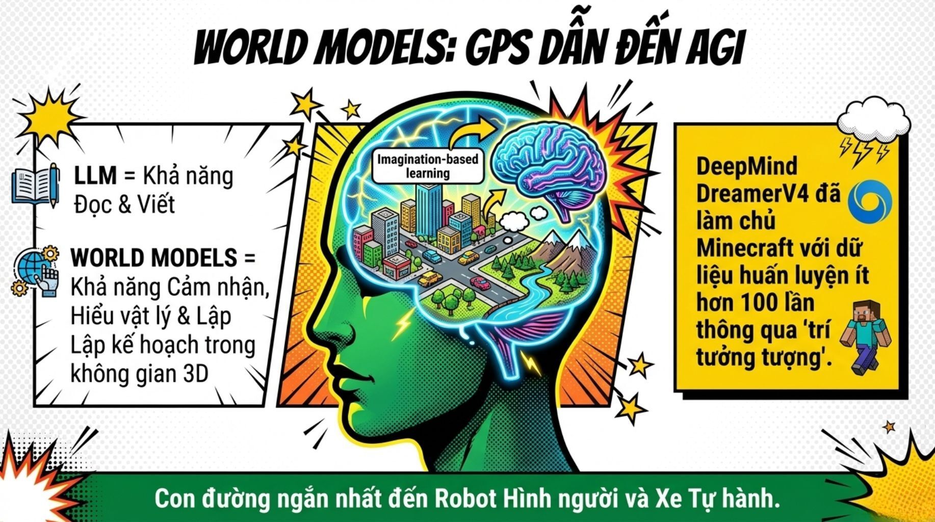 Nếu LLM là khả năng đọc và viết, thì World Models là khả năng cảm nhận, hiểu vật lý và lập kế hoạch trong không gian 3D. Khả năng này cực kỳ quan trọng đối với robot hình người (Humanoid Robots) và xe tự hành. Việc các nhà lãnh đạo chuyển hướng sang World Models cho thấy họ tin rằng đây là con đường ngắn nhất để đạt được Trí tuệ Nhân tạo Tổng quát (AGI).
