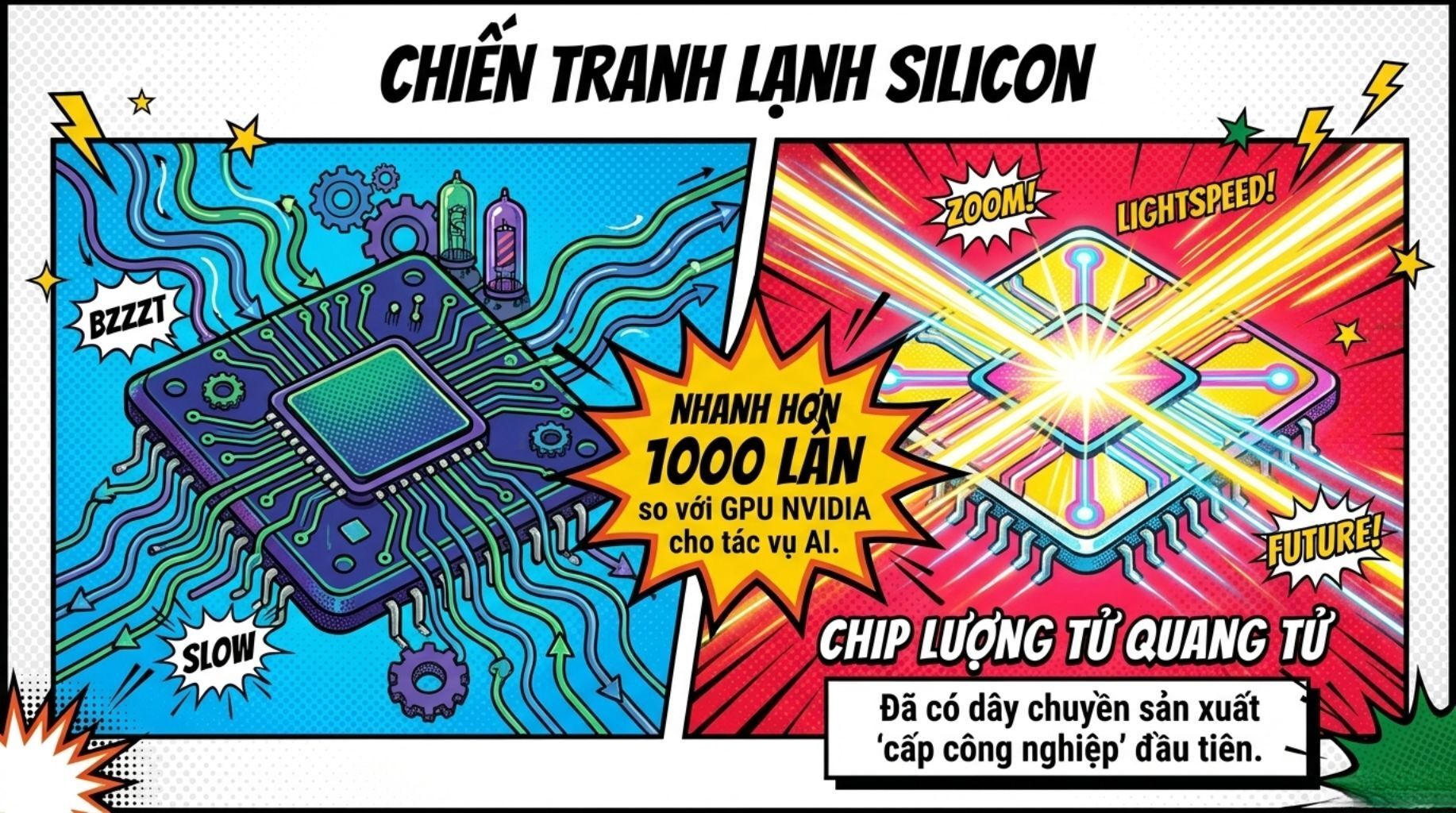 Cuộc chiến AI thực chất là một "Chiến tranh Lạnh Silicon". Trung Quốc đang có những bước tiến đột phá với chip lượng tử quang tử (photonic quantum chip). Loại chip này sử dụng ánh sáng (photon) thay vì electron, được tuyên bố có tốc độ nhanh hơn 1000 lần so với GPU của NVIDIA cho các tác vụ AI chuyên biệt. Quan trọng hơn, Trung Quốc đã có dây chuyền sản xuất "cấp công nghiệp" đầu tiên, cho thấy khả năng thương mại hóa nhanh chóng và đe dọa vị thế thống trị của phương Tây.