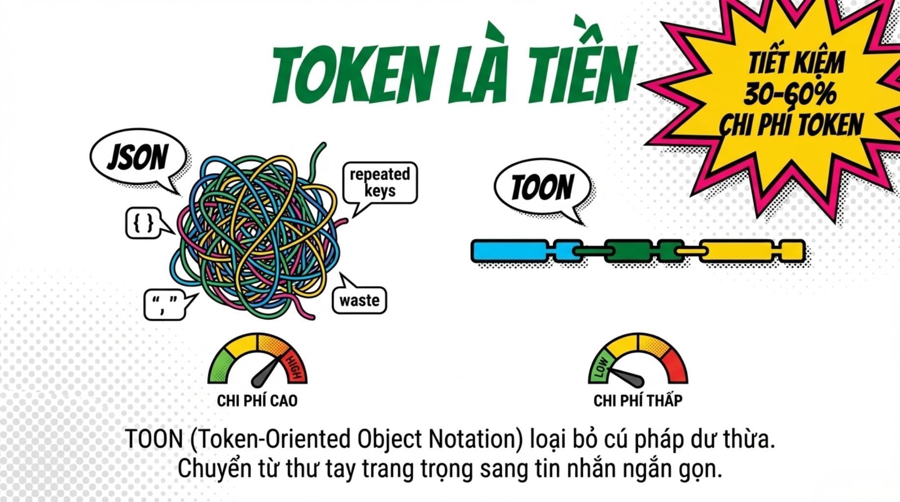 Chi phí sử dụng LLM phụ thuộc vào số lượng token. TOON (Token-Oriented Object Notation) là định dạng dữ liệu mã nguồn mở được thiết kế để giảm 30-60% chi phí token so với JSON truyền thống.