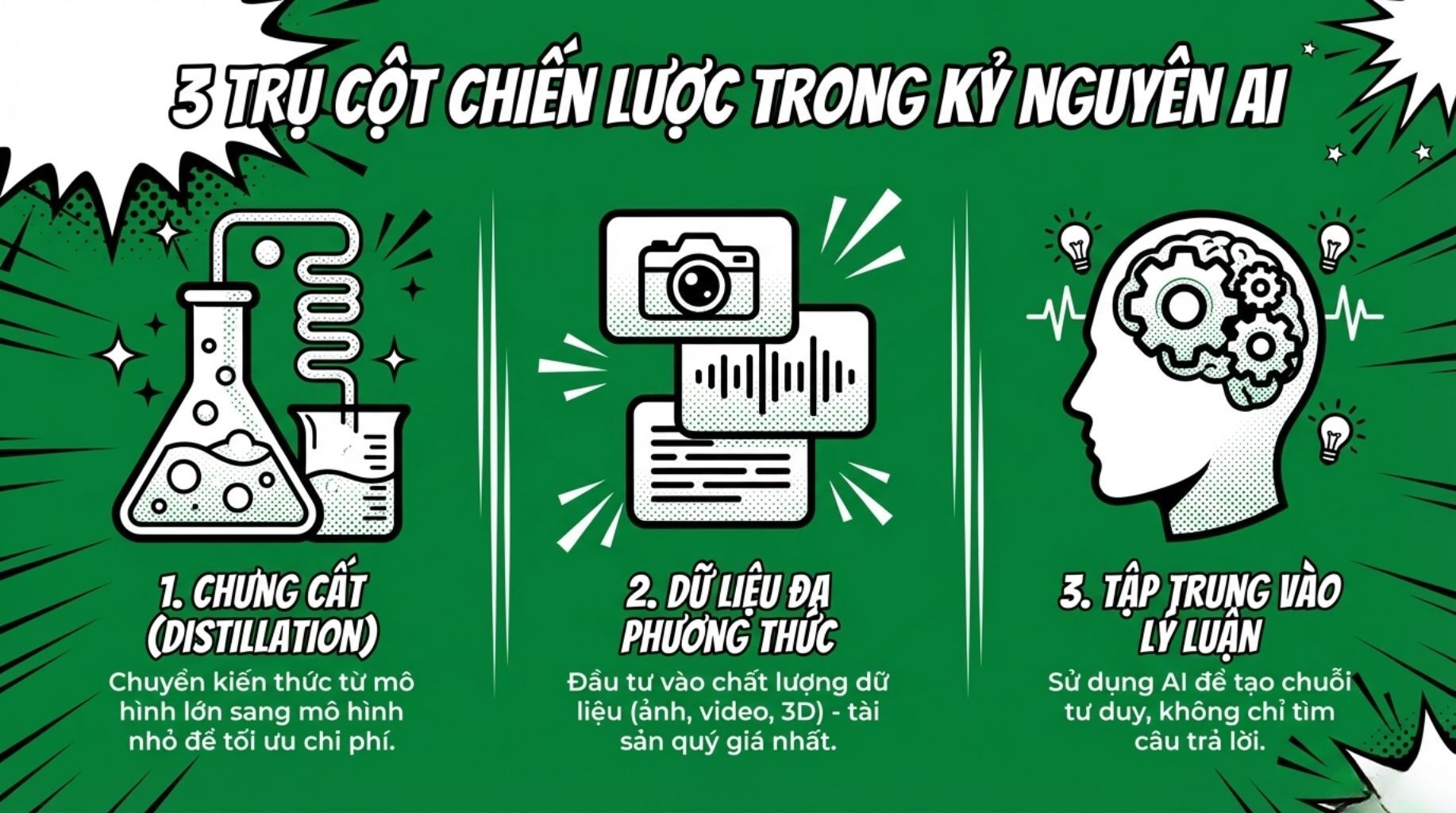 Tiến bộ của AI đang tuân theo một đường cong hàm mũ mượt mà . Điều này có nghĩa là sự thay đổi sẽ không dừng lại, và các doanh nghiệp cần phải thích nghi liên tục. Chiến lược hành động của bạn trong kỷ nguyên này có thể tập trung vào ba trụ cột chính: