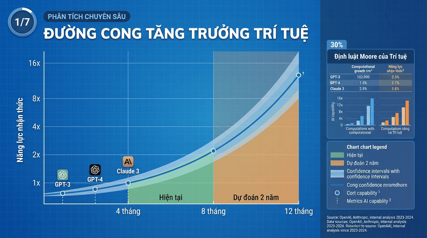Dario gọi đây là "Định luật Moore của Trí thông minh": khả năng nhận thức của các mô hình AI đang tăng gấp đôi mỗi 4-12 tháng.
