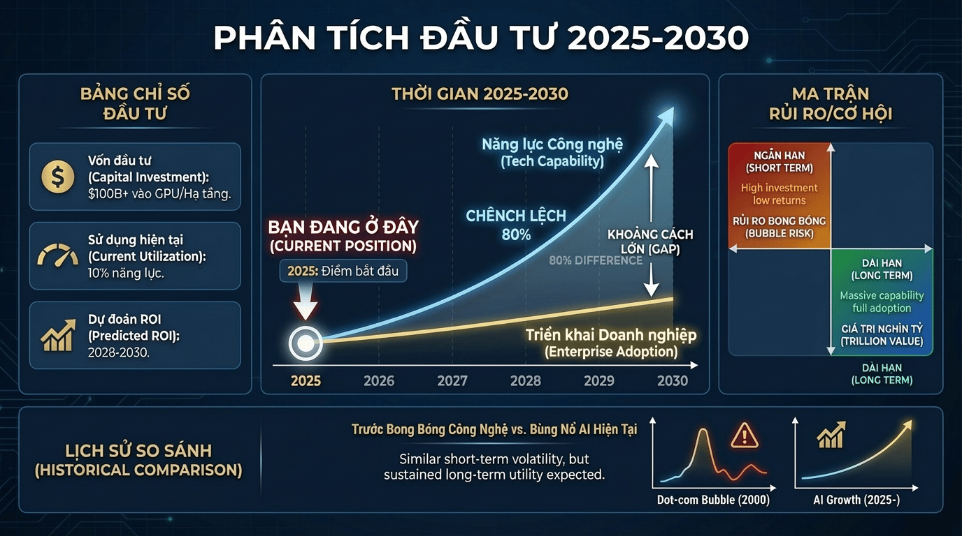Về mặt tài chính: Có một vấn đề về thời điểm. Các công ty công nghệ đang đầu tư hàng trăm tỷ đô la vào GPU và trung tâm dữ liệu ngay bây giờ để chuẩn bị cho nhu cầu sẽ đến trong 3-5 năm nữa.