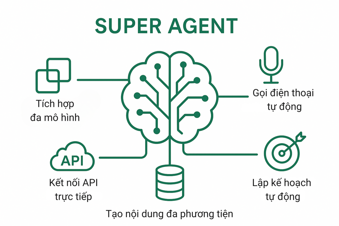 Kết nối API trực tiếp: Không giống như các agent bị giới hạn ở tác vụ web, Super Agent gọi API trực tiếp để truy xuất dữ liệu có cấu trúc và nhanh chóng, giảm đáng kể thời gian thực hiện và tỷ lệ lỗi.