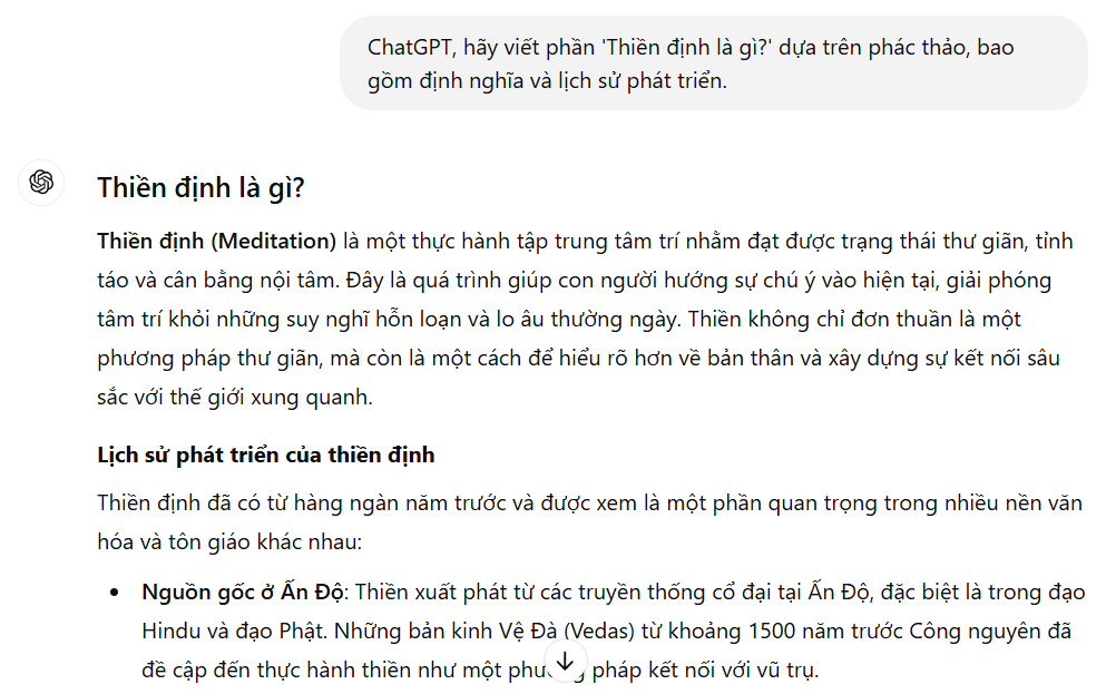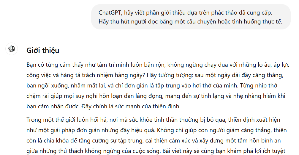 Hãy thêm ví dụ cụ thể hoặc câu chuyện thành công của người đã cải thiện sức khỏe tinh thần nhờ thiền định.Kết quả là ChatGPT sẽ mở rộng các câu chuyện thành công từ nghiên cứu giảm căng thẳng sau 8 tuần thiền đình đến 60% người tham gia cải thiện giấc ngủ từ nghiên cứu của Sleep Journal